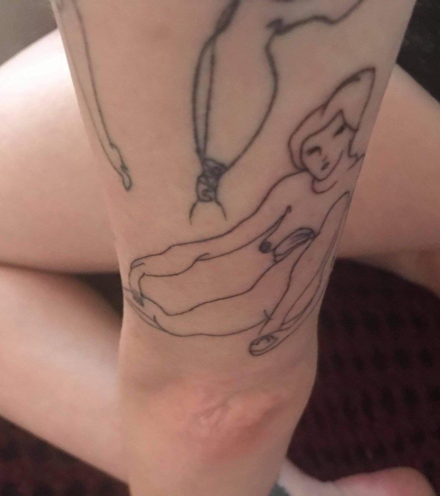 As I decorated myself, I felt more at ease in my skin. The black ink on my arms and legs gave me a reason to cover my body less, but I no longer felt the desperate shame of showing off. I felt proud of my body, and the work other artists had put into it. I love to give my partners a tour of my life through the art on my skin. My tattoos are a way of knowing me without asking. I’m finally at peace with the body I’ve been given, because I am able to change it.